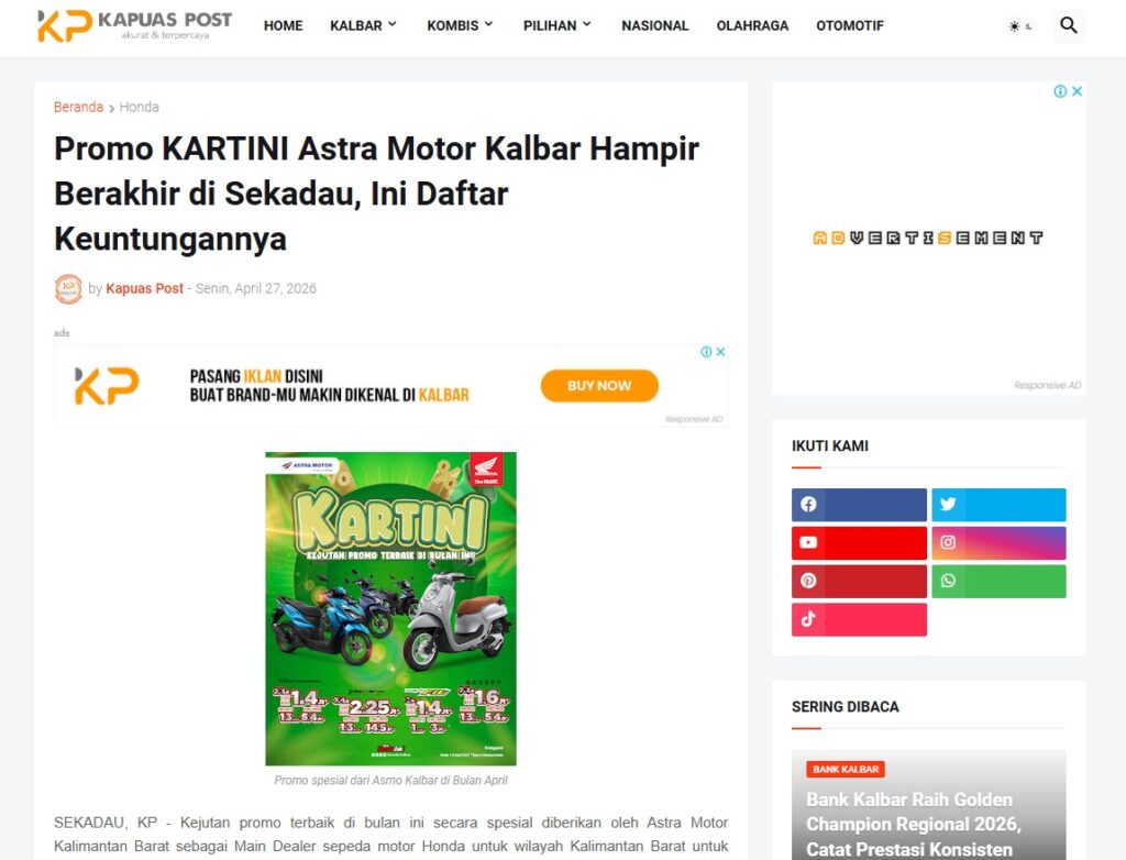Promo KARTINI Astra Motor Kalbar Hampir Berakhir di Sekadau, Ini Daftar Keuntungannya by Muhammad Arif 27 April 2026 in Silahkan kunjungi https://www.kapuaspost.web.id/2026/04/promo-kartini-astra-motor-kalbar-hampir.html. Tags: astra Astra Motor kalbar Astra Motor Pontianak astramotor honda kalbar pontianak sepeda motor You Might Like Regional Public Launching New ADV160 The SUV Pride Grand Launching New PCX 160 Truly Exceptional! Tetap hati-hati ya bro sist berkendara saat hujan.