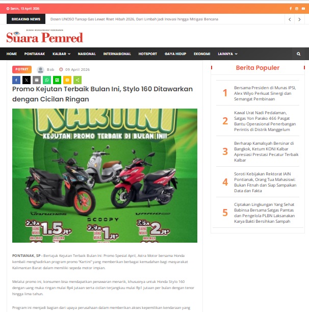 Promo Kejutan Terbaik Bulan Ini, Stylo 160 Ditawarkan dengan Cicilan Ringan by masmul 9 April 2026 in Silahkan kunjungi https://www.suarapemredkalbar.com/read/potret/09042026/promo-kejutan-terbaik-bulan-ini-stylo-160-ditawarkan-dengan-cicilan-ringan. You Might Like Regional Public Launching New ADV160 The SUV Pride Grand Launching New PCX 160 Truly Exceptional! Tetap hati-hati ya bro sist berkendara saat hujan.