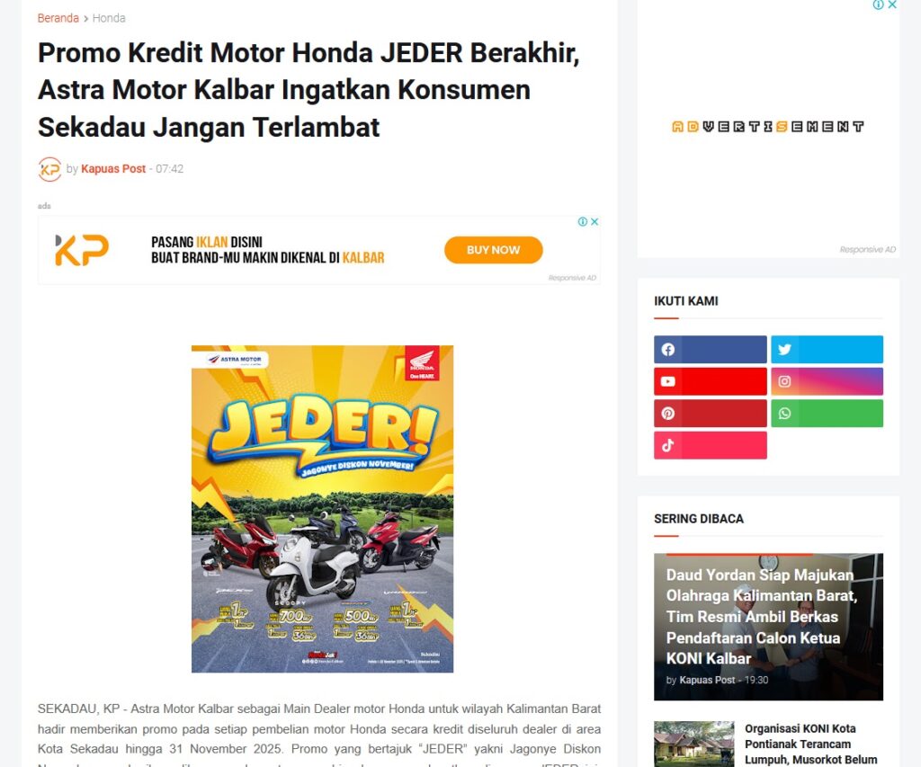 Promo Kredit Motor Honda JEDER Berakhir, Astra Motor Kalbar Ingatkan Konsumen Sekadau Jangan Terlambat by Muhammad Arif 28 November 2025 in Silahkan kunjungi https://www.kapuaspost.web.id/2025/11/promo-kredit-motor-honda-jeder-berakhir.html. Tags: astra Astra Motor kalbar Astra Motor Pontianak astramotor honda kalbar pontianak sepeda motor You Might Like Regional Public Launching New ADV160 The SUV Pride Grand Launching New PCX 160 Truly Exceptional! Tetap hati-hati ya bro sist berkendara saat hujan.