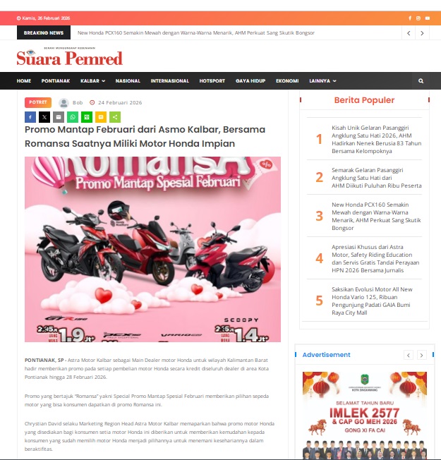 Promo Mantap Februari dari Asmo Kalbar, Bersama Romansa Saatnya Miliki Motor Honda Impian by masmul 24 Februari 2026 in Silahkan kunjungi https://www.suarapemredkalbar.com/read/potret/24022026/promo-mantap-februari-dari-asmo-kalbar-bersama-romansa-saatnya-miliki-motor-honda-impian. You Might Like Regional Public Launching New ADV160 The SUV Pride Grand Launching New PCX 160 Truly Exceptional! Tetap hati-hati ya bro sist berkendara saat hujan.