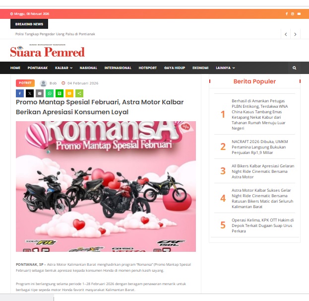 Promo Mantap Spesial Februari, Astra Motor Kalbar Berikan Apresiasi Konsumen Loyal by masmul 4 Februari 2026 in Silahkan kunjungi https://www.suarapemredkalbar.com/read/potret/04022026/promo-mantap-spesial-februari-astra-motor-kalbar-berikan-apresiasi-konsumen-loyal. You Might Like Regional Public Launching New ADV160 The SUV Pride Grand Launching New PCX 160 Truly Exceptional! Tetap hati-hati ya bro sist berkendara saat hujan.