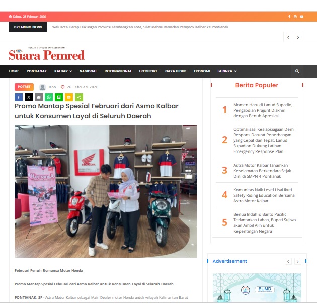 Promo Mantap Spesial Februari dari Asmo Kalbar untuk Konsumen Loyal di Seluruh Daerah by masmul 26 Februari 2026 in Silahkan kunjungi https://www.suarapemredkalbar.com/read/potret/26022026/promo-mantap-spesial-februari-dari-asmo-kalbar-untuk-konsumen-loyal-di-seluruh-daerah. You Might Like Regional Public Launching New ADV160 The SUV Pride Grand Launching New PCX 160 Truly Exceptional! Tetap hati-hati ya bro sist berkendara saat hujan.
