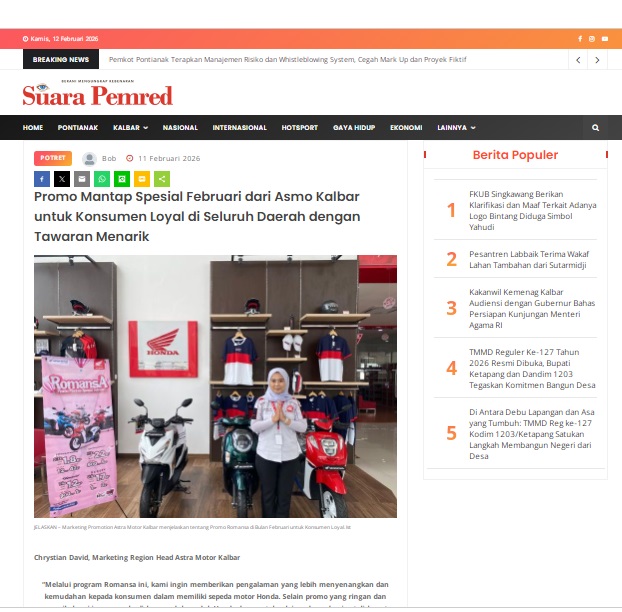 Promo Mantap Spesial Februari dari Asmo Kalbar untuk Konsumen Loyal di Seluruh Daerah dengan Tawaran Menarik by masmul 11 Februari 2026 in Silahkan kunjungi https://www.suarapemredkalbar.com/read/potret/11022026/promo-mantap-spesial-februari-dari-asmo-kalbar-untuk-konsumen-loyal-diseluruh-daerah-dengan-tawaran-menarik. You Might Like Regional Public Launching New ADV160 The SUV Pride Grand Launching New PCX 160 Truly Exceptional! Tetap hati-hati ya bro sist berkendara saat hujan.