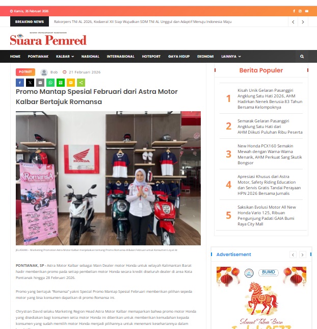 Promo Mantap Spesial Februari dari Astra Motor Kalbar Bertajuk Romansa by masmul 21 Februari 2026 in Silahkan kunjungi https://www.suarapemredkalbar.com/read/potret/21022026/promo-mantap-spesial-februari-dari-astra-motor-kalbar-bertajuk-romansa. You Might Like Regional Public Launching New ADV160 The SUV Pride Grand Launching New PCX 160 Truly Exceptional! Tetap hati-hati ya bro sist berkendara saat hujan.