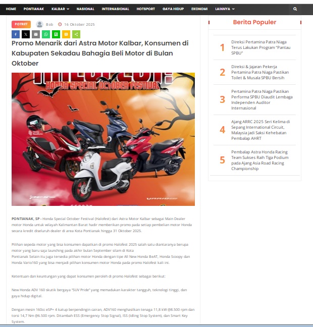 Promo Menarik dari Astra Motor Kalbar, Konsumen di Kabupaten Sekadau Bahagia Beli Motor di Bulan Oktober by masmul 16 Oktober 2025 in Silahkan kunjungi https://www.suarapemredkalbar.com/read/potret/16102025/promo-menarik-dari-astra-motor-kalbar-konsumen-di-kabupaten-sekadau-bahagia-beli-motor-di-bulan-oktober. You Might Like Regional Public Launching New ADV160 The SUV Pride Grand Launching New PCX 160 Truly Exceptional! Tetap hati-hati ya bro sist berkendara saat hujan.
