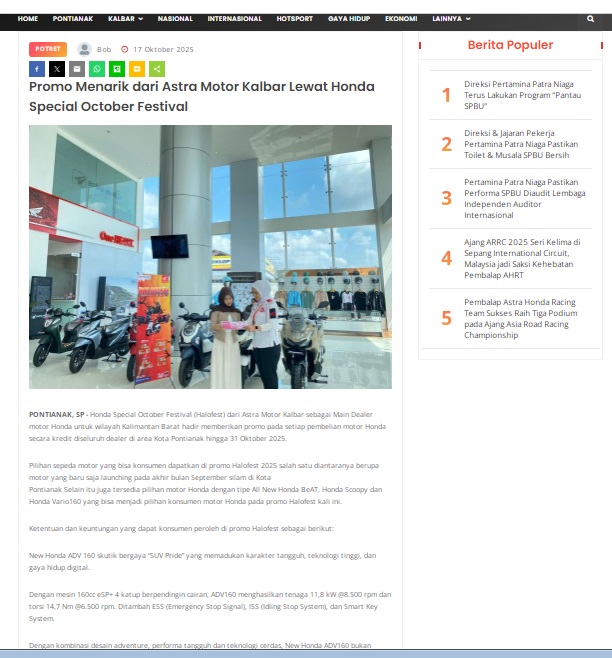 Promo Menarik dari Astra Motor Kalbar Lewat Honda Special October Festival by masmul 17 Oktober 2025 in Silahkan kunjungi https://www.suarapemredkalbar.com/read/potret/17102025/promo-menarik-dari-astra-motor-kalbar-lewat-honda-special-october-festival. You Might Like Regional Public Launching New ADV160 The SUV Pride Grand Launching New PCX 160 Truly Exceptional! Tetap hati-hati ya bro sist berkendara saat hujan.