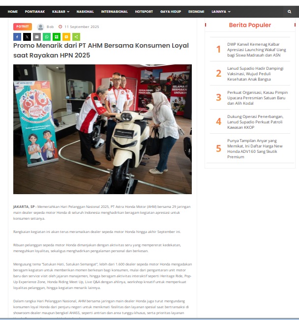 Promo Menarik dari PT AHM Bersama Konsumen Loyal saat Rayakan HPN 2025 by masmul 11 September 2025 in Silahkan kunjungi https://www.suarapemredkalbar.com/read/potret/11092025/promo-menarik-dari-pt-ahm-bersama-konsumen-loyal-saat-rayakan-hpn-2025. You Might Like Regional Public Launching New ADV160 The SUV Pride Grand Launching New PCX 160 Truly Exceptional! Tetap hati-hati ya bro sist berkendara saat hujan.