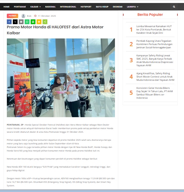 Promo Motor Honda di HALOFEST dari Astra Motor Kalbar by masmul 11 Oktober 2025 in Silahkan kunjungi https://www.suarapemredkalbar.com/read/potret/11102025/promo-motor-honda-di-halofest-dari-astra-motor-kalbar. You Might Like Regional Public Launching New ADV160 The SUV Pride Grand Launching New PCX 160 Truly Exceptional! Tetap hati-hati ya bro sist berkendara saat hujan.