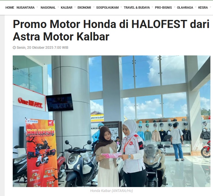 Promo Motor Honda di HALOFEST dari Astra Motor Kalbar by Dedi 20 Oktober 2025 in Silahkan kunjungi https://kalbar.antaranews.com/berita/670229/promo-motor-honda-di-halofest-dari-astra-motor-kalbar. You Might Like Regional Public Launching New ADV160 The SUV Pride Grand Launching New PCX 160 Truly Exceptional! Tetap hati-hati ya bro sist berkendara saat hujan.
