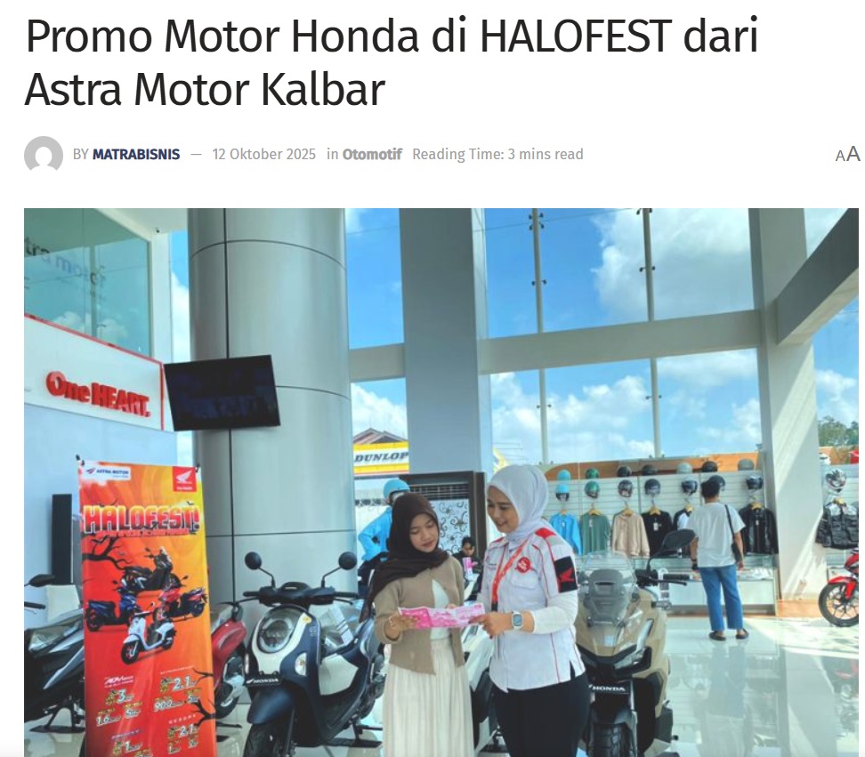 Promo Motor Honda di HALOFEST dari Astra Motor Kalbar by Sri Yuliantiningsih 12 Oktober 2025 in Silahkan kunjungi https://matrabisnis.id/2025/10/12/promo-motor-honda-di-halofest-dari-astra-motor-kalbar/. You Might Like Regional Public Launching New ADV160 The SUV Pride Grand Launching New PCX 160 Truly Exceptional! Tetap hati-hati ya bro sist berkendara saat hujan.