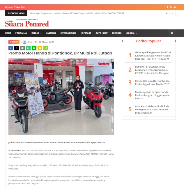 Promo Motor Honda di Pontianak, DP Mulai Rp1 Jutaan by masmul 22 Maret 2026 in Silahkan kunjungi https://www.suarapemredkalbar.com/read/potret/22032026/promo-motor-honda-di-pontianak-dp-mulai-rp1-jutaan. You Might Like Regional Public Launching New ADV160 The SUV Pride Grand Launching New PCX 160 Truly Exceptional! Tetap hati-hati ya bro sist berkendara saat hujan.