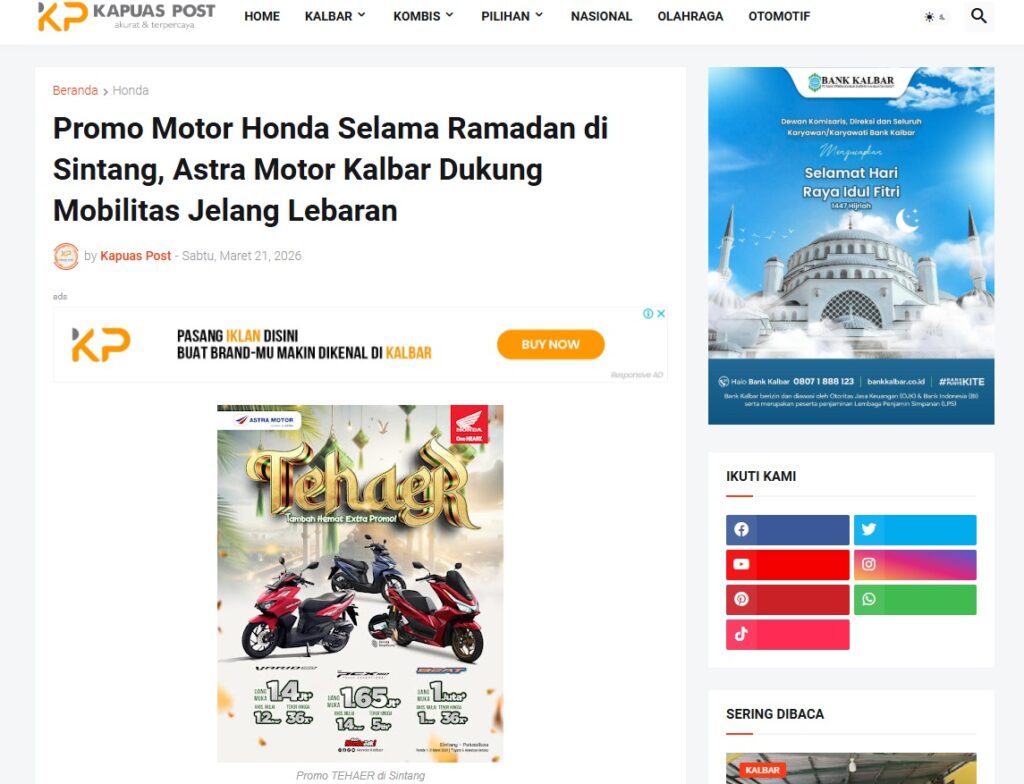 Promo Motor Honda Selama Ramadan di Sintang, Astra Motor Kalbar Dukung Mobilitas Jelang Lebaran by Muhammad Arif 21 Maret 2026 in Silahkan kunjungi https://www.kapuaspost.web.id/2026/03/promo-motor-honda-selama-ramadan-di.html. Tags: astra Astra Motor kalbar Astra Motor Pontianak astramotor honda kalbar pontianak sepeda motor You Might Like Regional Public Launching New ADV160 The SUV Pride Grand Launching New PCX 160 Truly Exceptional! Tetap hati-hati ya bro sist berkendara saat hujan.