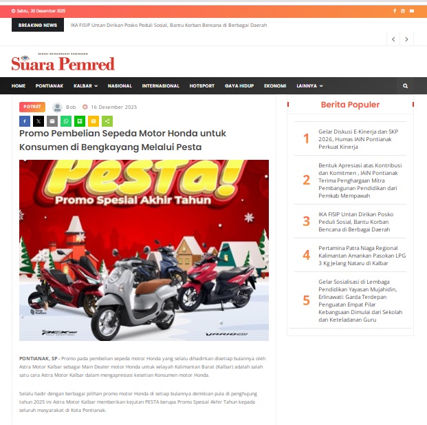 Promo Pembelian Sepeda Motor Honda untuk Konsumen di Bengkayang Melalui Pesta by masmul 16 Desember 2025 in Silahkan kunjungi https://www.suarapemredkalbar.com/read/potret/16122025/promo-pembelian-sepeda-motor-honda-untuk-konsumen-di-bengkayang-melalui-pesta. You Might Like Regional Public Launching New ADV160 The SUV Pride Grand Launching New PCX 160 Truly Exceptional! Tetap hati-hati ya bro sist berkendara saat hujan.