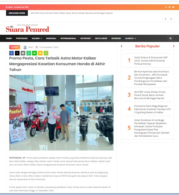 Promo Pesta, Cara Terbaik Astra Motor Kalbar Mengapresiasi Kesetian Konsumen Honda di Akhir Tahun by masmul 16 Desember 2025 in Silahkan kunjungi https://www.suarapemredkalbar.com/read/potret/16122025/promo-pesta-cara-terbaik-astra-motor-kalbar-mengapresiasi-kesetian-konsumen-honda-di-akhir-tahun. You Might Like Regional Public Launching New ADV160 The SUV Pride Grand Launching New PCX 160 Truly Exceptional! Tetap hati-hati ya bro sist berkendara saat hujan.