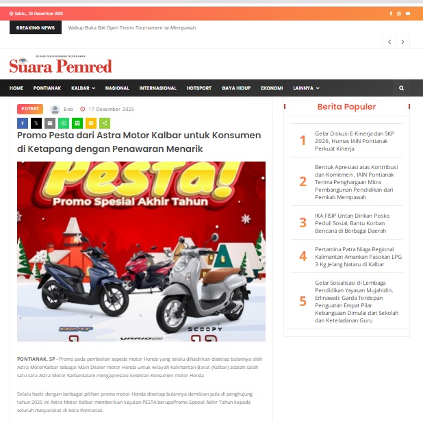 Promo Pesta dari Astra Motor Kalbar untuk Konsumen di Ketapang dengan Penawaran Menarik by masmul 17 Desember 2025 in Silahkan kunjungi https://www.suarapemredkalbar.com/read/potret/17122025/promo-pesta-dari-astra-motor-kalbar-untuk-konsumen-di-ketapang-dengan-penawaran-menarik. You Might Like Regional Public Launching New ADV160 The SUV Pride Grand Launching New PCX 160 Truly Exceptional! Tetap hati-hati ya bro sist berkendara saat hujan.
