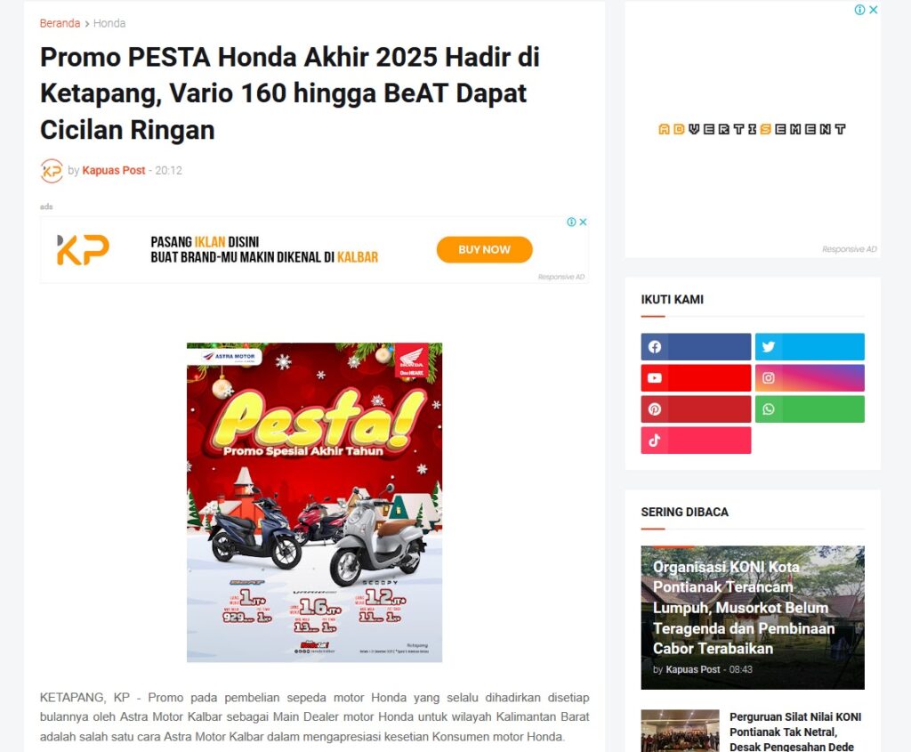 Promo PESTA Honda Akhir 2025 Hadir di Ketapang, Vario 160 hingga BeAT Dapat Cicilan Ringan by Muhammad Arif 11 Desember 2025 in Silahkan kunjungi https://www.kapuaspost.web.id/2025/12/promo-pesta-honda-akhir-2025-hadir-di.html. Tags: astra Astra Motor kalbar Astra Motor Pontianak astramotor honda kalbar pontianak sepeda motor You Might Like Regional Public Launching New ADV160 The SUV Pride Grand Launching New PCX 160 Truly Exceptional! Tetap hati-hati ya bro sist berkendara saat hujan.