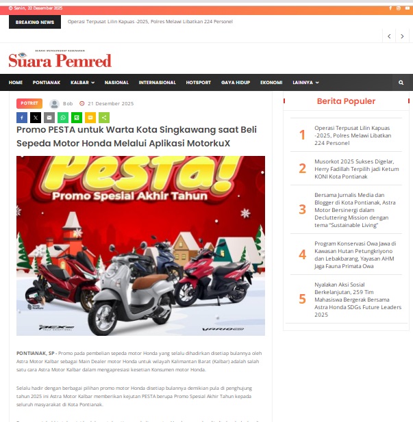 Promo PESTA untuk Warta Kota Singkawang saat Beli Sepeda Motor Honda Melalui Aplikasi MotorkuX by masmul 21 Desember 2025 in Silahkan kunjungi https://www.suarapemredkalbar.com/read/potret/21122025/promo-pesta-untuk-warta-kota-singkawang-saat-beli-sepeda-motor-honda-melalui-aplikasi-motorkux. You Might Like Regional Public Launching New ADV160 The SUV Pride Grand Launching New PCX 160 Truly Exceptional! Tetap hati-hati ya bro sist berkendara saat hujan.