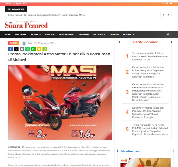 Promo Proklamasi Astra Motor Kalbar Bikin Konsumen di Melawi by masmul 25 Agustus 2025 in Silahkan kunjungi https://www.suarapemredkalbar.com/read/potret/25082025/promo-proklamasi-astra-motor-kalbar-bikin-konsumen-di-melawi. You Might Like Regional Public Launching New ADV160 The SUV Pride Grand Launching New PCX 160 Truly Exceptional! Tetap hati-hati ya bro sist berkendara saat hujan.