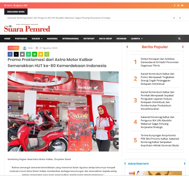 Promo Proklamasi dari Astra Motor Kalbar Semarakkan HUT ke-80 Kemerdekaan Indonesia by masmul 27 Agustus 2025 in Silahkan kunjungi https://www.suarapemredkalbar.com/read/potret/27082025/promo-proklamasi-dari-astra-motor-kalbar-semarakkan-hut-ke-80-kemerdekaan-indonesia. You Might Like Regional Public Launching New ADV160 The SUV Pride Grand Launching New PCX 160 Truly Exceptional! Tetap hati-hati ya bro sist berkendara saat hujan.