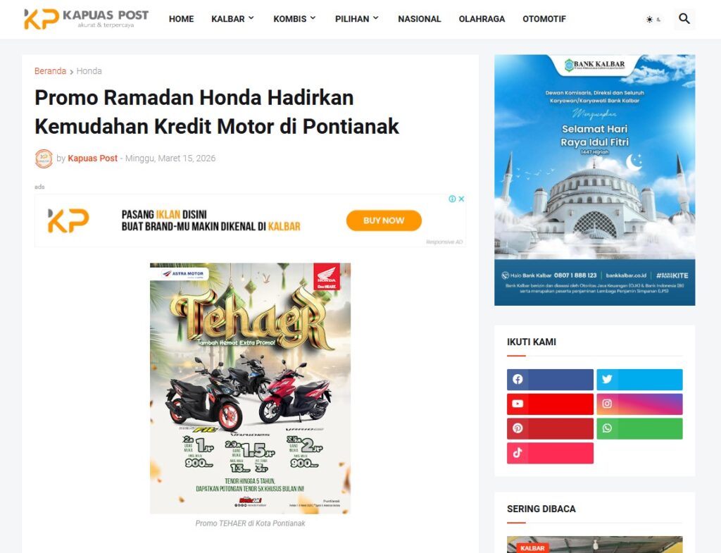 Promo Ramadan Honda Hadirkan Kemudahan Kredit Motor di Pontianak by Muhammad Arif 15 Maret 2026 in Silahkan kunjungi https://www.kapuaspost.web.id/2026/03/promo-ramadan-honda-hadirkan-kemudahan.html. Tags: astra Astra Motor kalbar Astra Motor Pontianak astramotor honda kalbar pontianak sepeda motor You Might Like Regional Public Launching New ADV160 The SUV Pride Grand Launching New PCX 160 Truly Exceptional! Tetap hati-hati ya bro sist berkendara saat hujan.