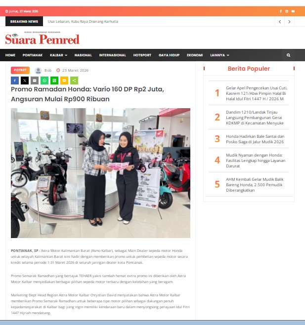 Promo Ramadan Honda: Vario 160 DP Rp2 Juta, Angsuran Mulai Rp900 Ribuan by masmul 23 Maret 2026 in Silahkan kunjungi https://www.suarapemredkalbar.com/read/potret/23032026/promo-ramadan-honda-vario-160-dp-rp2-juta-angsuran-mulai-rp900-ribuan. You Might Like Regional Public Launching New ADV160 The SUV Pride Grand Launching New PCX 160 Truly Exceptional! Tetap hati-hati ya bro sist berkendara saat hujan.