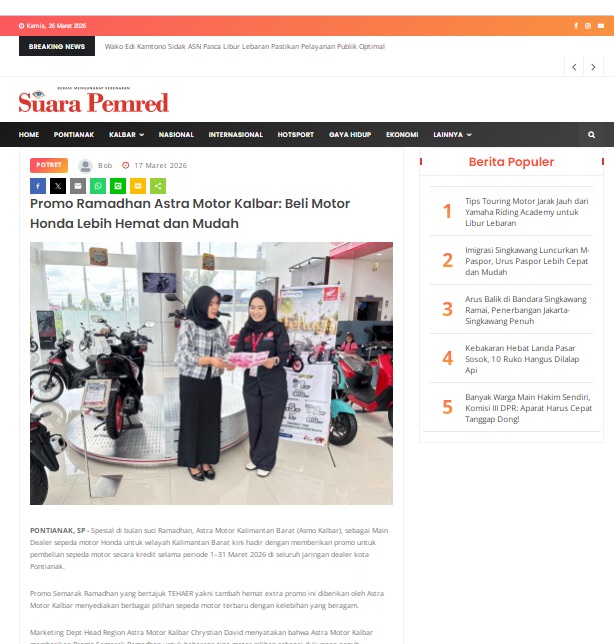 Promo Ramadhan Astra Motor Kalbar: Beli Motor Honda Lebih Hemat dan Mudah by masmul 17 Maret 2026 in Silahkan kunjungi https://www.suarapemredkalbar.com/read/potret/17032026/promo-ramadhan-astra-motor-kalbar-beli-motor-honda-lebih-hemat-dan-mudah. You Might Like Regional Public Launching New ADV160 The SUV Pride Grand Launching New PCX 160 Truly Exceptional! Tetap hati-hati ya bro sist berkendara saat hujan.