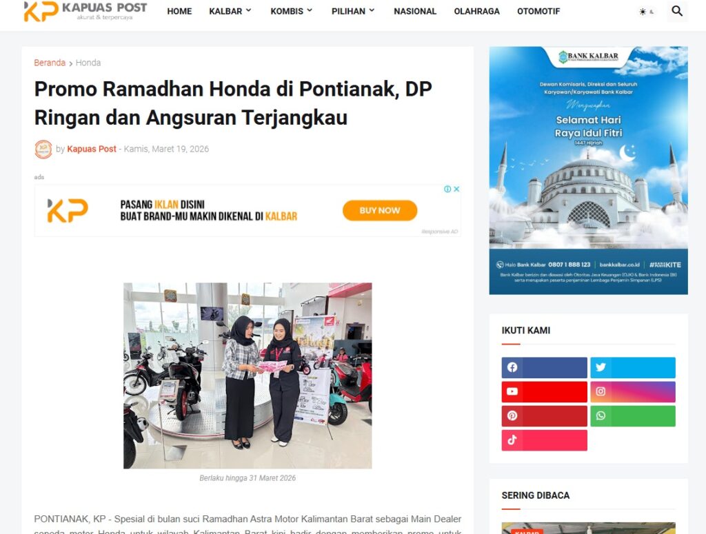 Promo Ramadhan Honda di Pontianak, DP Ringan dan Angsuran Terjangkau by Muhammad Arif 19 Maret 2026 in Silahkan kunjungi https://www.kapuaspost.web.id/2026/03/promo-ramadhan-honda-di-pontianak-dp.html. Tags: astra Astra Motor kalbar Astra Motor Pontianak astramotor honda kalbar pontianak sepeda motor You Might Like Regional Public Launching New ADV160 The SUV Pride Grand Launching New PCX 160 Truly Exceptional! Tetap hati-hati ya bro sist berkendara saat hujan.