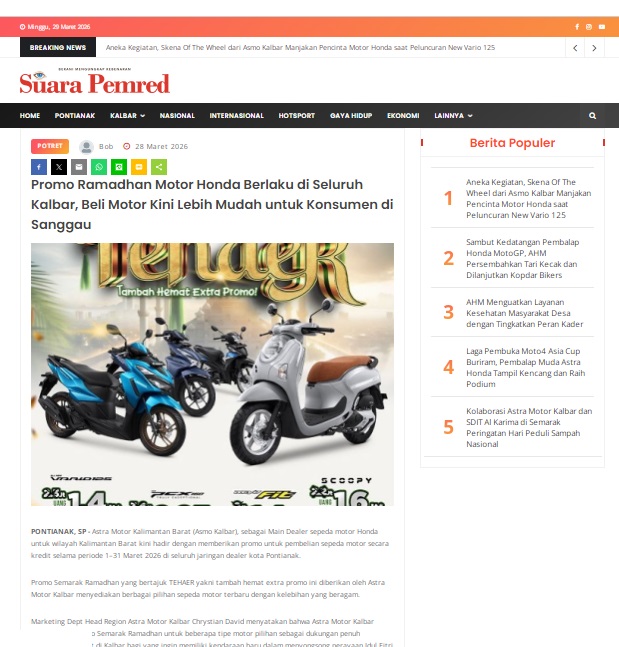 Promo Ramadhan Motor Honda Berlaku di Seluruh Kalbar, Beli Motor Kini Lebih Mudah untuk Konsumen di Sanggau by masmul 28 Maret 2026 in Silahkan kunjungi https://www.suarapemredkalbar.com/read/potret/28032026/promo-ramadhan-motor-honda-berlaku-di-seluruh-kalbar-beli-motor-kini-lebih-mudah-untuk-konsumen-di-sanggau. You Might Like Regional Public Launching New ADV160 The SUV Pride Grand Launching New PCX 160 Truly Exceptional! Tetap hati-hati ya bro sist berkendara saat hujan.
