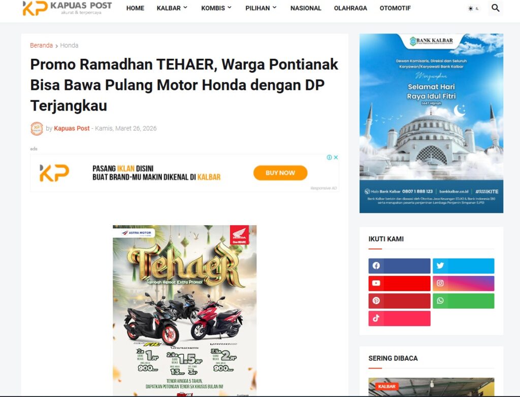 Promo Ramadhan TEHAER, Warga Pontianak Bisa Bawa Pulang Motor Honda dengan DP Terjangkau by Muhammad Arif 26 Maret 2026 in Silahkan kunjungi https://www.kapuaspost.web.id/2026/03/promo-ramadhan-tehaer-warga-pontianak.html. Tags: astra Astra Motor kalbar Astra Motor Pontianak astramotor honda kalbar pontianak sepeda motor You Might Like Regional Public Launching New ADV160 The SUV Pride Grand Launching New PCX 160 Truly Exceptional! Tetap hati-hati ya bro sist berkendara saat hujan.
