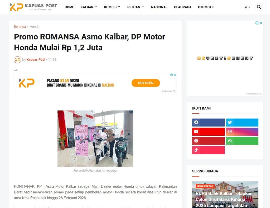 Promo ROMANSA Asmo Kalbar, DP Motor Honda Mulai Rp 1,2 Juta by Muhammad Arif 16 Februari 2026 in Silahkan kunjungi https://www.kapuaspost.web.id/2026/02/promo-romansa-asmo-kalbar-dp-motor.html. Tags: astra Astra Motor kalbar Astra Motor Pontianak astramotor honda kalbar pontianak sepeda motor You Might Like Regional Public Launching New ADV160 The SUV Pride Grand Launching New PCX 160 Truly Exceptional! Tetap hati-hati ya bro sist berkendara saat hujan.