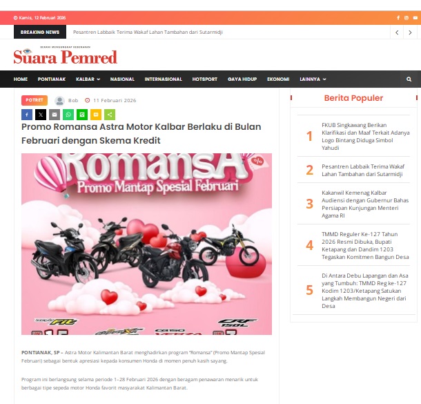 Promo Romansa Astra Motor Kalbar Berlaku di Bulan Februari dengan Skema Kredit by masmul 11 Februari 2026 in Silahkan kunjungi https://www.suarapemredkalbar.com/read/potret/11022026/promo-romansa-astra-motor-kalbar-berlaku-di-bulan-februari-dengan-skema-kredit. You Might Like Regional Public Launching New ADV160 The SUV Pride Grand Launching New PCX 160 Truly Exceptional! Tetap hati-hati ya bro sist berkendara saat hujan.