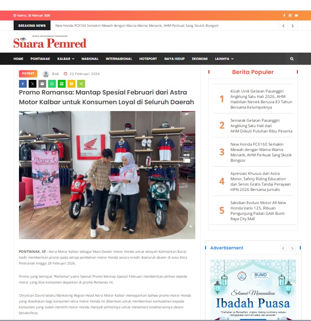 Promo Romansa: Mantap Spesial Februari dari Astra Motor Kalbar untuk Konsumen Loyal di Seluruh Daerah by masmul 22 Februari 2026 in Silahkan kunjungi https://www.suarapemredkalbar.com/read/potret/22022026/promo-romansa-mantap-spesial-februari-dari-astra-motor-kalbar-untuk-konsumen-loyal-diseluruh-daerah. You Might Like Regional Public Launching New ADV160 The SUV Pride Grand Launching New PCX 160 Truly Exceptional! Tetap hati-hati ya bro sist berkendara saat hujan.