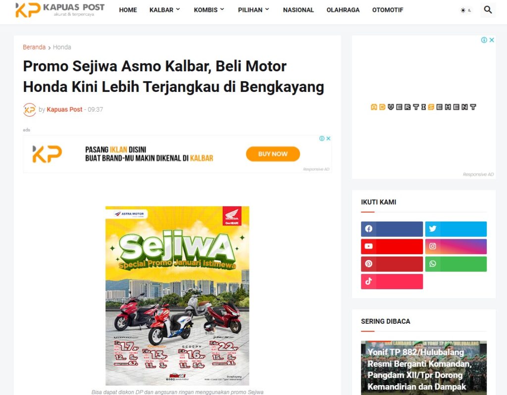 Promo Sejiwa Asmo Kalbar, Beli Motor Honda Kini Lebih Terjangkau di Bengkayang by Muhammad Arif 25 Januari 2026 in Silahkan kunjungi https://www.kapuaspost.web.id/2026/01/promo-sejiwa-asmo-kalbar-beli-motor.html. Tags: astra Astra Motor kalbar Astra Motor Pontianak astramotor honda kalbar pontianak sepeda motor You Might Like Regional Public Launching New ADV160 The SUV Pride Grand Launching New PCX 160 Truly Exceptional! Tetap hati-hati ya bro sist berkendara saat hujan.