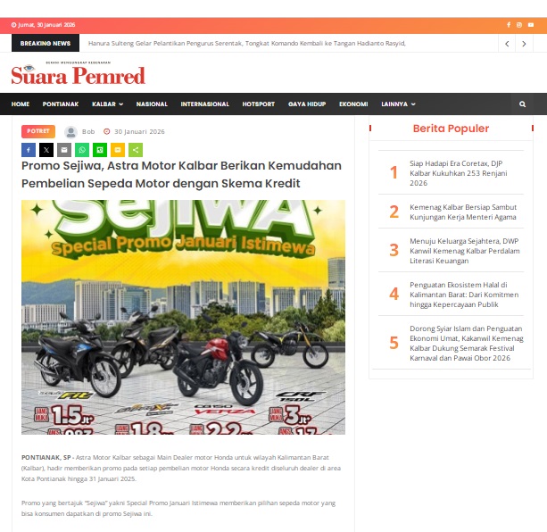 Promo Sejiwa, Astra Motor Kalbar Berikan Kemudahan Pembelian Sepeda Motor dengan Skema Kredit by masmul 30 Januari 2026 in Silahkan kunjungi https://www.suarapemredkalbar.com/read/potret/30012026/promo-sejiwa-astra-motor-kalbar-berikan-kemudahan-pembelian-sepeda-motor-dengan-skema-kredit. You Might Like Regional Public Launching New ADV160 The SUV Pride Grand Launching New PCX 160 Truly Exceptional! Tetap hati-hati ya bro sist berkendara saat hujan.