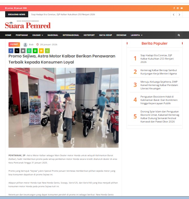 Promo Sejiwa, Astra Motor Kalbar Berikan Penawaran Terbaik kepada Konsumen Loyal by masmul 28 Januari 2026 in Silahkan kunjungi https://www.suarapemredkalbar.com/read/potret/28012026/promo-sejiwa-astra-motor-kalbar-berikan-penawaran-terbaik-kepada-konsumen-loyal. You Might Like Regional Public Launching New ADV160 The SUV Pride Grand Launching New PCX 160 Truly Exceptional! Tetap hati-hati ya bro sist berkendara saat hujan.