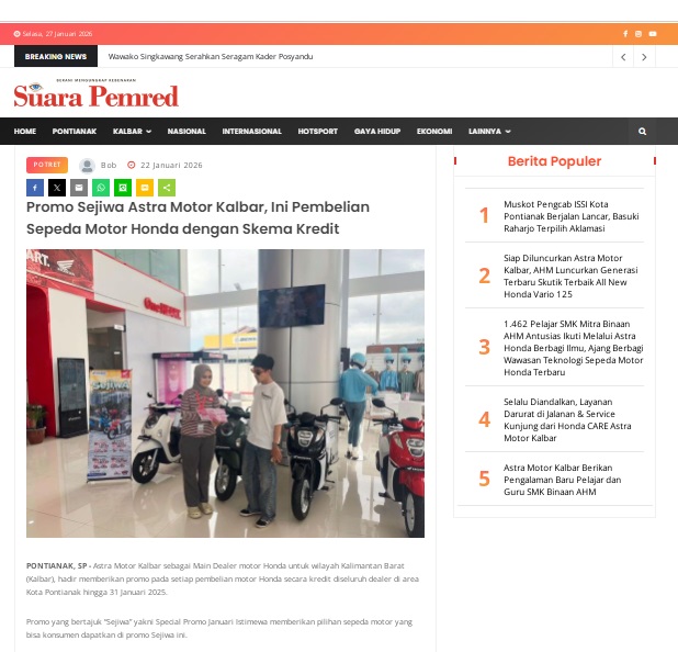 Promo Sejiwa Astra Motor Kalbar, Ini Pembelian Sepeda Motor Honda dengan Skema Kredit by masmul 22 Januari 2026 in Silahkan kunjungi https://www.suarapemredkalbar.com/read/potret/22012026/promo-sejiwa-astra-motor-kalbar-ini-pembelian-sepeda-motor-honda-dengan-skema-kredit. You Might Like Regional Public Launching New ADV160 The SUV Pride Grand Launching New PCX 160 Truly Exceptional! Tetap hati-hati ya bro sist berkendara saat hujan.