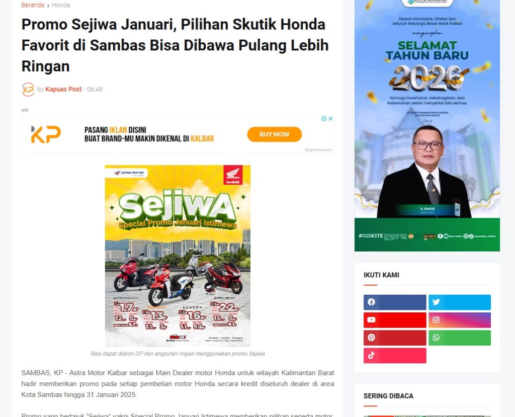 Promo Sejiwa Januari, Pilihan Skutik Honda Favorit di Sambas Bisa Dibawa Pulang Lebih Ringan by Muhammad Arif 10 Januari 2026 in Silahkan kunjungi https://www.kapuaspost.web.id/2026/01/promo-sejiwa-januari-pilihan-skutik.html. Tags: astra Astra Motor kalbar Astra Motor Pontianak astramotor honda kalbar pontianak sepeda motor You Might Like Regional Public Launching New ADV160 The SUV Pride Grand Launching New PCX 160 Truly Exceptional! Tetap hati-hati ya bro sist berkendara saat hujan.