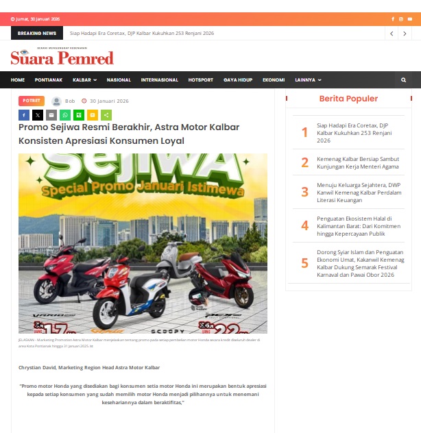 Promo Sejiwa Resmi Berakhir, Astra Motor Kalbar Konsisten Apresiasi Konsumen Loyal by masmul 30 Januari 2026 in Silahkan kunjungi https://www.suarapemredkalbar.com/read/potret/30012026/promo-sejiwa-resmi-berakhir-astra-motor-kalbar-konsisten-apresiasi-konsumen-loyal. You Might Like Regional Public Launching New ADV160 The SUV Pride Grand Launching New PCX 160 Truly Exceptional! Tetap hati-hati ya bro sist berkendara saat hujan.