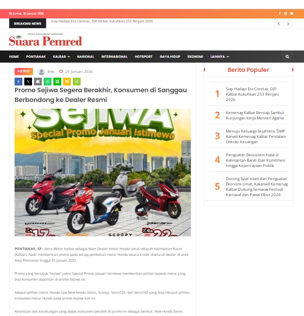 Promo Sejiwa Segera Berakhir, Konsumen di Sanggau Berbondong ke Dealer Resmi by masmul 29 Januari 2026 in Silahkan kunjungi https://www.suarapemredkalbar.com/read/potret/29012026/promo-sejiwa-segera-berakhir-konsumen-di-sanggau-berbondong-ke-dealer-resmi. You Might Like Regional Public Launching New ADV160 The SUV Pride Grand Launching New PCX 160 Truly Exceptional! Tetap hati-hati ya bro sist berkendara saat hujan.