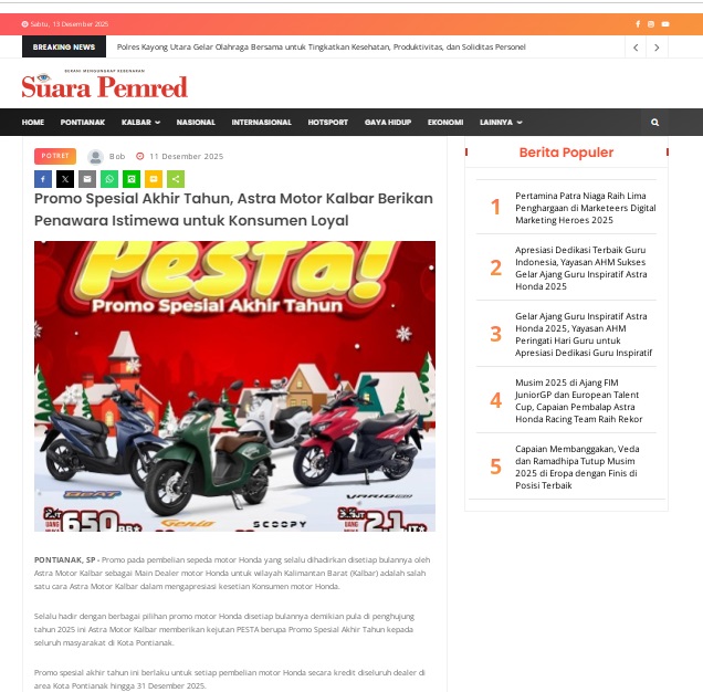 Promo Spesial Akhir Tahun, Astra Motor Kalbar Berikan Penawara Istimewa untuk Konsumen Loyal by masmul 10 Desember 2025 in Silahkan kunjungi https://www.suarapemredkalbar.com/read/potret/11122025/promo-spesial-akhir-tahun-astra-motor-kalbar-berikan-penawara-istimewa-untuk-konsumen-loyal. You Might Like Regional Public Launching New ADV160 The SUV Pride Grand Launching New PCX 160 Truly Exceptional! Tetap hati-hati ya bro sist berkendara saat hujan.