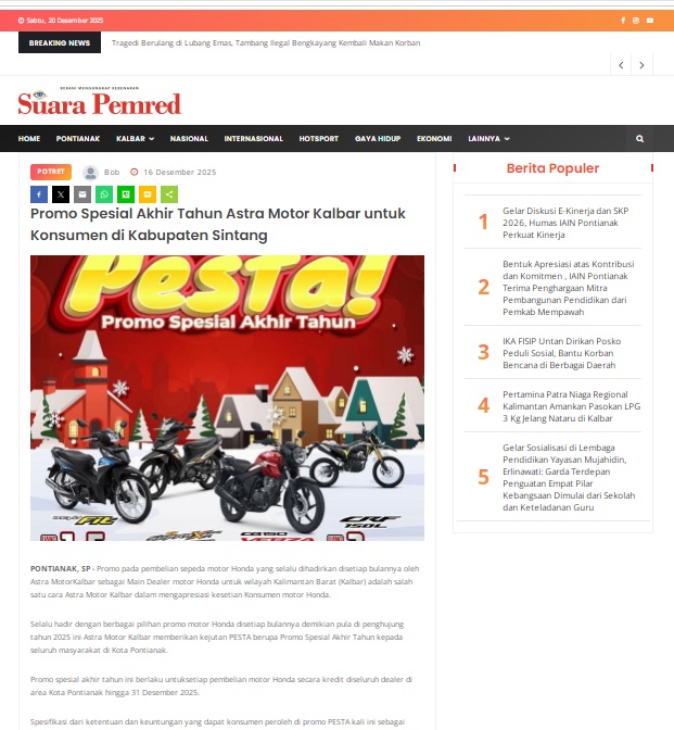 Promo Spesial Akhir Tahun Astra Motor Kalbar untuk Konsumen di Kabupaten Sintang m by masmul 16 Desember 2025 in Silahkan kunjungi https://www.suarapemredkalbar.com/read/potret/16122025/promo-spesial-akhir-tahun-astra-motor-kalbar-untuk-konsumen-di-kabupaten-sintang. You Might Like Regional Public Launching New ADV160 The SUV Pride Grand Launching New PCX 160 Truly Exceptional! Tetap hati-hati ya bro sist berkendara saat hujan.