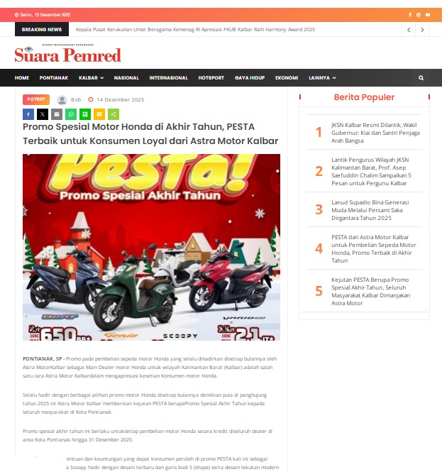 Promo Spesial Motor Honda di Akhir Tahun, PESTA Terbaik untuk Konsumen Loyal dari Astra Motor Kalbar by masmul 14 Desember 2025 in Silahkan kunjungi https://www.suarapemredkalbar.com/read/potret/14122025/promo-spesial-motor-honda-di-akhir-tahun-pesta-terbaik-untuk-konsumen-loyal-dari-astra-motor-kalbar. You Might Like Regional Public Launching New ADV160 The SUV Pride Grand Launching New PCX 160 Truly Exceptional! Tetap hati-hati ya bro sist berkendara saat hujan.