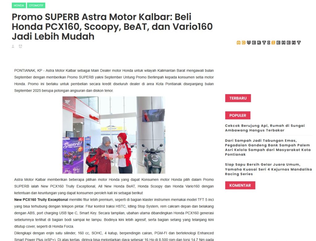 Promo SUPERB Astra Motor Kalbar: Beli Honda PCX160, Scoopy, BeAT, dan Vario160 Jadi Lebih Mudah by Muhammad Arif 28 September 2025 in Silahkan kunjungi https://www.kapuaspost.web.id/2025/09/promo-superb-astra-motor-kalbar-beli.html. Tags: astra Astra Motor kalbar Astra Motor Pontianak astramotor honda kalbar pontianak sepeda motor You Might Like Regional Public Launching New ADV160 The SUV Pride Grand Launching New PCX 160 Truly Exceptional! Tetap hati-hati ya bro sist berkendara saat hujan.