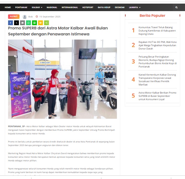 Promo SUPERB dari Astra Motor Kalbar Awali Bulan September dengan Penawaran Istimewa by masmul 15 September 2025 in Silahkan kunjungi https://www.suarapemredkalbar.com/read/potret/15092025/promo-superb-dari-astra-motor-kalbar-awali-bulan-september-dengan-penawaran-istimewa. You Might Like Regional Public Launching New ADV160 The SUV Pride Grand Launching New PCX 160 Truly Exceptional! Tetap hati-hati ya bro sist berkendara saat hujan.