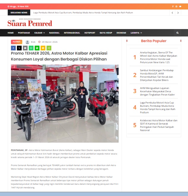 Promo TEHAER 2026, Astra Motor Kalbar Apresiasi Konsumen Loyal dengan Berbagai Diskon Pilihan by masmul 28 Maret 2026 in Silahkan kunjungi https://www.suarapemredkalbar.com/read/potret/28032026/promo-tehaer-2026-astra-motor-kalbar-apresiasi-konsumen-loyal-dengan-berbagai-diskon-pilihan. You Might Like Regional Public Launching New ADV160 The SUV Pride Grand Launching New PCX 160 Truly Exceptional! Tetap hati-hati ya bro sist berkendara saat hujan.