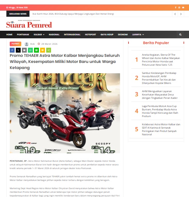 Promo TEHAER Astra Motor Kalbar Menjangkau Seluruh Wilayah, Kesempatan Miliki Motor Baru untuk Warga Ketapang by masmul 28 Maret 2026 in Silahkan kunjungi https://www.suarapemredkalbar.com/read/potret/28032026/promo-tehaer-astra-motor-kalbar-menjangkau-seluruh-wilayah-kesempatan-miliki-motor-baru-untuk-warga-ketapang. You Might Like Regional Public Launching New ADV160 The SUV Pride Grand Launching New PCX 160 Truly Exceptional! Tetap hati-hati ya bro sist berkendara saat hujan.