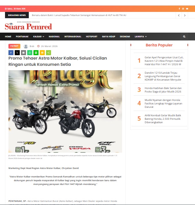 Promo Tehaer Astra Motor Kalbar, Solusi Cicilan Ringan untuk Konsumen Setia by masmul 26 Maret 2026 in Silahkan kunjungi https://www.suarapemredkalbar.com/read/potret/26032026/promo-tehaer-astra-motor-kalbar-solusi-cicilan-ringan-untuk-konsumen-setia. You Might Like Regional Public Launching New ADV160 The SUV Pride Grand Launching New PCX 160 Truly Exceptional! Tetap hati-hati ya bro sist berkendara saat hujan.