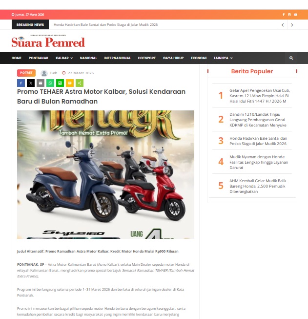 Promo TEHAER Astra Motor Kalbar, Solusi Kendaraan Baru di Bulan Ramadhan by masmul 22 Maret 2026 in Silahkan kunjungi https://www.suarapemredkalbar.com/read/potret/22032026/promo-tehaer-astra-motor-kalbar-solusi-kendaraan-baru-di-bulan-ramadhan. You Might Like Regional Public Launching New ADV160 The SUV Pride Grand Launching New PCX 160 Truly Exceptional! Tetap hati-hati ya bro sist berkendara saat hujan.