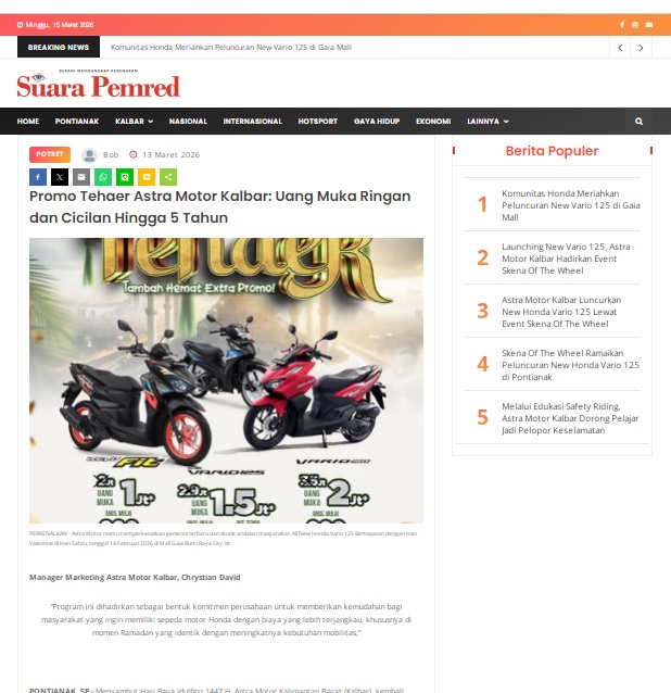 Promo Tehaer Astra Motor Kalbar: Uang Muka Ringan dan Cicilan Hingga 5 Tahun by masmul 13 Maret 2026 in Silahkan kunjungi https://www.suarapemredkalbar.com/read/potret/13032026/promo-tehaer-astra-motor-kalbar-uang-muka-ringan-dan-cicilan-hingga-5-tahun-1. You Might Like Regional Public Launching New ADV160 The SUV Pride Grand Launching New PCX 160 Truly Exceptional! Tetap hati-hati ya bro sist berkendara saat hujan.