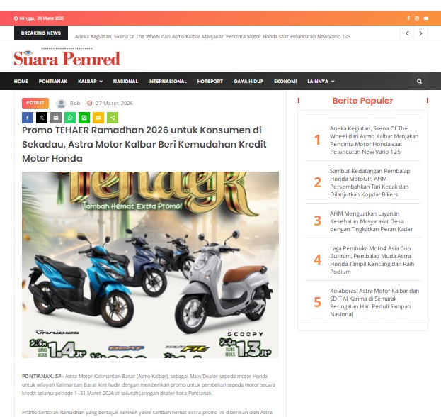 Promo TEHAER Ramadhan 2026 untuk Konsumen di Sekadau, Astra Motor Kalbar Beri Kemudahan Kredit Motor Honda by masmul 27 Maret 2026 in Silahkan kunjungi https://www.suarapemredkalbar.com/read/potret/27032026/promo-tehaer-ramadhan-2026-untuk-konsumen-di-sekadau-astra-motor-kalbar-beri-kemudahan-kredit-motor-honda. You Might Like Regional Public Launching New ADV160 The SUV Pride Grand Launching New PCX 160 Truly Exceptional! Tetap hati-hati ya bro sist berkendara saat hujan.